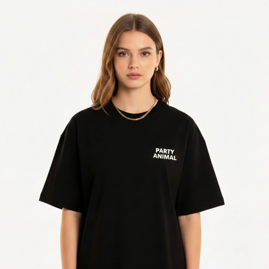 Own the night without saying a word. The Party Animal tee is the ultimate uniform for the after-hours crowd. Cut with a generous, boxy fit and dropped shoulders, this shirt delivers that perfect effortless drape.